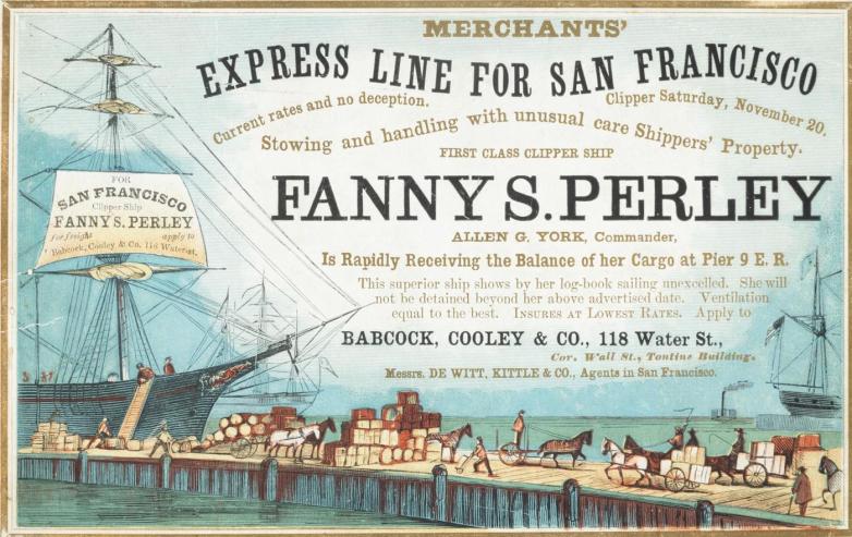 Rare gold rush-era clipper ship sailing card. Estimate: $10,000-15,000
