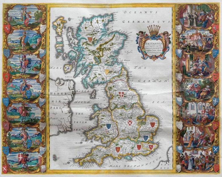 Johannes Blaeu’s Britannia prout from the 17th century, with miniatures to panels on each side of the map