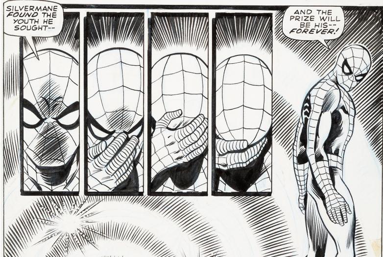 Among the offerings is Page 18 from 1969’s Amazing Spider-Man No. 75, in which Spider-Man watches the vanishing of the villain called Silvermane, who seems to de-age until he fades into “nothingness.” Romita and inker Jim Mooney feature the hero in every single panel as he anguishes over the heart-rending end of the gangster born as Silvio Manfredi. The page echoes the image on the cover of this classic issue.