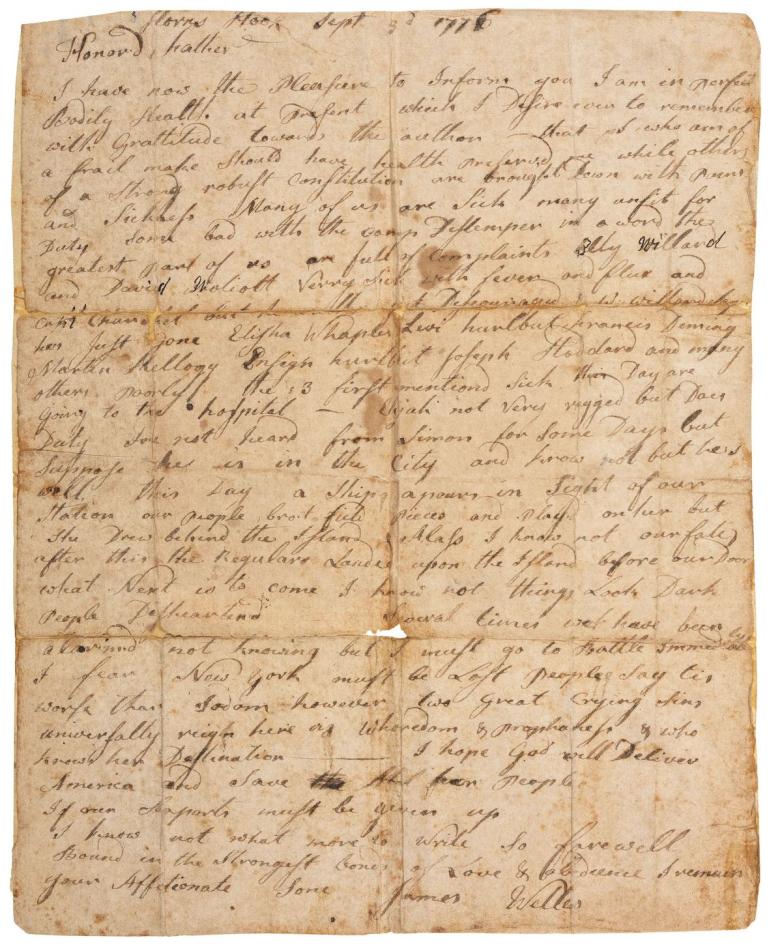 • Lot 7 – A 1776 letter from a Continental Army soldier to his father detailing the disastrous loss at the Battle of Long Island (Est. $500 - $700) – Sold for $11,250