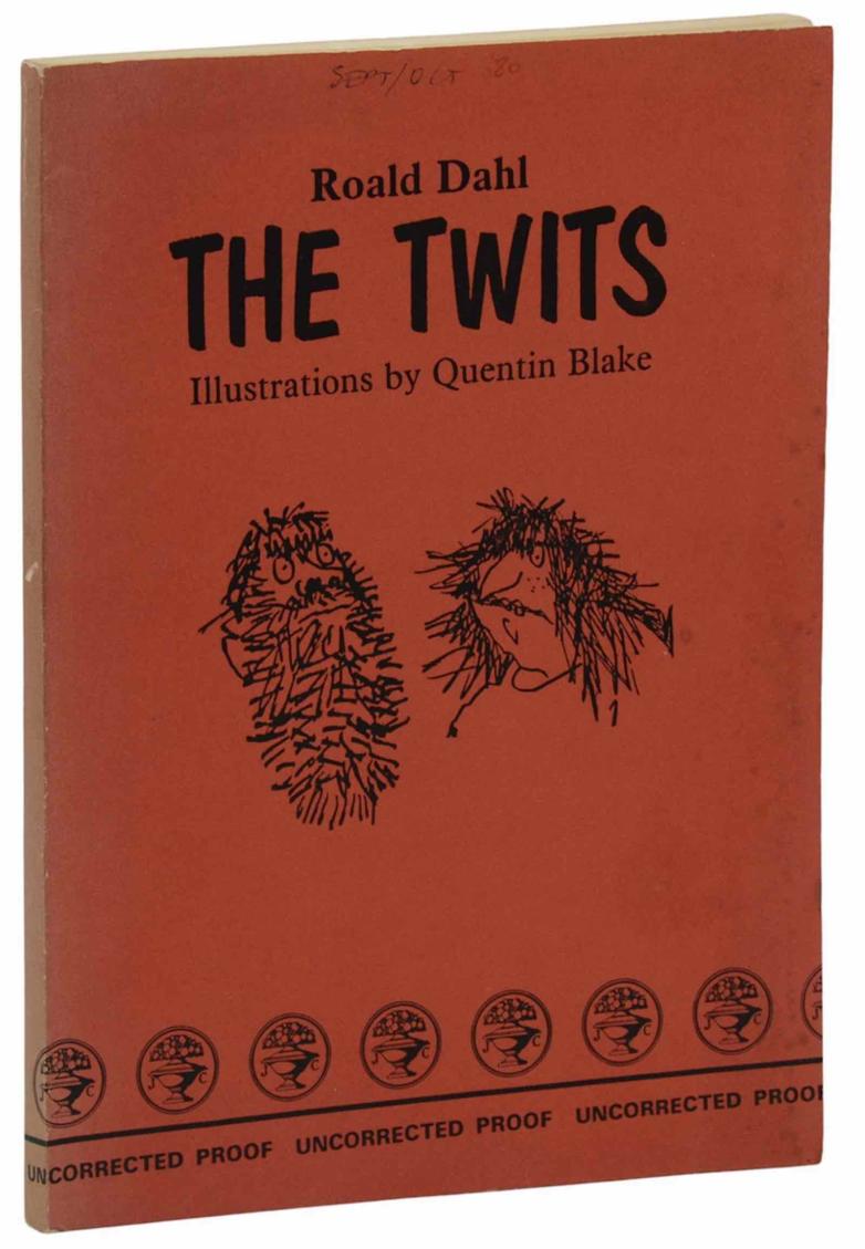 * The Twits by Roald Dahl, Quentin Blake (illustrator). London, Jonathan Cape, 1980. Advance uncorrected proof of the first edition. Bound in publisher's red wraps printed in black. A rare format. Available from Burnside Rare Books.
