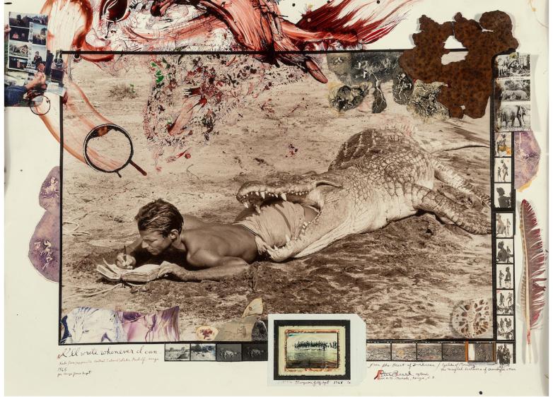 Another top Beard lot in the auction is I'll Write Wherever I Can... (estimate: $60,000-80,000). According to his nephew, Anson Beard, Peter Beard once told a novice photographer: “Don’t worry so much about the camera. Focus on the subject matter. Don’t worry so much about the camera. Focus on the subject matter. The subject matter! Create.” Signed and inscribed in ink throughout the sheet by Beard, who was known for his images of Africans and African wildlife, I’ll Write Wherever I Can captures that spirit in a man writing in a diary despite losing his lower half into the mouth of a hungry crocodile. The image might have begun as a part of his series Eyelids of the Morning, his study of crocodiles.