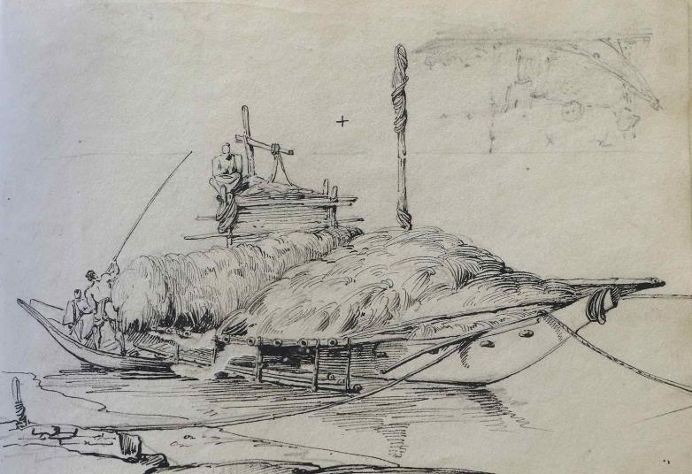 The book contains scenes of a breast-feeding mother, men praying, squatting, sitting, smoking and sleeping, dogs, cattle, and a team loading a large boat, and is annotated with a modified version of the shorthand taught to Chinnery by his writing master father. According to an inscription, the sketchbook was given to Harriet Paget in 1826 by General Sir Edward Paget GCB (1775-1849), a British Army officer, Governor of Ceylon and Commander-in-Chief in India. It was then lent in 1837 to Henry W Paget (1768-1854), 1st Marquess of Anglesey and Earl of Uxbridge who lost his leg at Waterloo.