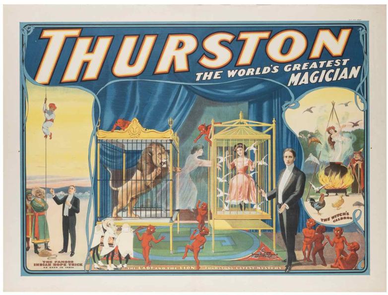 Potter & Potter's Late Summer Magicana Auction realized nearly $425,000 with a 99% sell through rate. Sale highlights included Thurston the World’s Greatest Magician. The Lady and the Lion. Estimated at $10,000-15,000 and eventually making $43,200, this one-sheet poster depicted three illusions from early in Thurston’s career. It was published by the Strobridge Litho. Co. in 1909.
