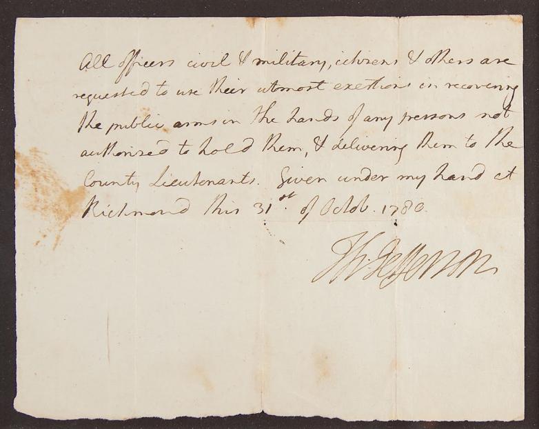 And Thomas Jefferson, in a one-page Revolutionary War-dated document as governor of Virginia, boldly penned and signed by Jefferson on October 31, 1780. Governor Jefferson calls upon the Virginia citizenry, intent on "recovering the public arms" for the local militia. (Estimate: $15,000+)